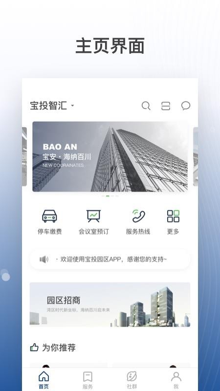 宝投智汇app是一款为各企业提供园区服务的软件,让企业能够享受智慧园区生活,提高企业办公效率;应用中有多种功能,用户可以在这里体验到不同类型的服务内容,帮助用户快速缴纳各种费用,让用户能够更轻松的出入园区;用户通过软件可以看到园区的各种活动内容,参与各种活动享受一定的福利和优惠,提高自己的园区生活质量;在这里,用户还可以和园区中的其他人进行在线交流,一起沟通各种生活内容,结识更多的商业人士,为企业拓展更多的人脉;快下载这款软件试试吧,体验各种园区服务,更便捷的办公。