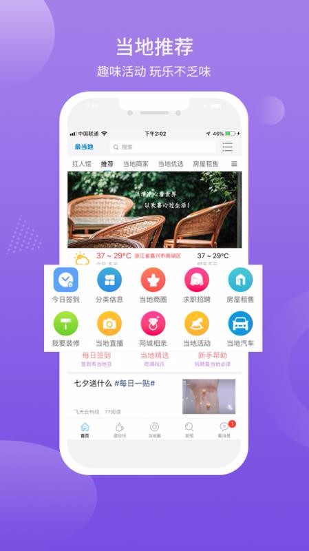 1、随时为你推荐当地的各种信息,趣味活动、吃喝玩乐等,涵盖了生活的各个方面;