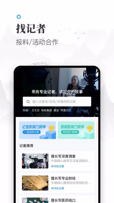 牛媒是一个新闻媒体大数据平台,在线即可找记者进行曝光、爆料、采访等,相应的记者可以在该平台中获取更多的新闻信息和采访对象;为用户提供了记者影响力榜单,选择日榜、周榜或月榜即可查看上榜的记者,也可以选择时间段进行筛选,为你显示了具体的影响力指数;随时为用户推荐不同类型的记者,按照分类进行推送,比如擅长写深度调查、擅长写专业财经、擅长写医药线口等类型;选择记者添加为好友后即可私聊对方,为用户提供了信息模板,录入联系申请类型、报料、地点和详情内容后即可发送给记者,记者同意申请后即可开始聊天。