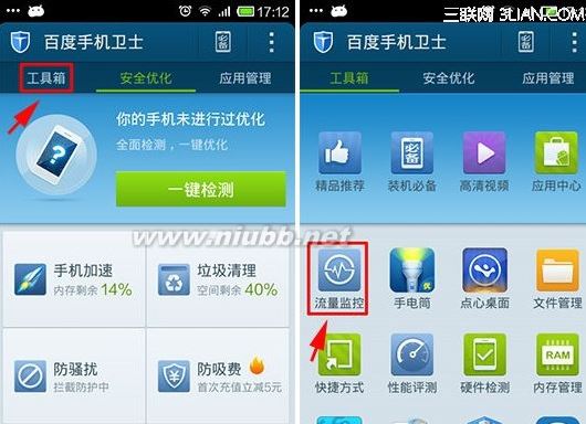 本文话题:怎么控制手机流量,教程,智能手机教程,手机软件教程 1)打开百度手机卫士软件,点击工具箱,再点击流量监控; ![]() 2)出现请设置归属地,精确校准流量,先点击设置归属地,出现省份,运营商,运营商品牌三个选项,选择完后点击保存并校准; ![]() 3)此时会跳转到省流量助手,可以点击开启,也可点击不开启,退出省流量助手,回到流量监控界面, 设置套餐限额,输入数值后点击确定; ![]() 4)此时可点击校准流量,分为手动调整和自动调整; ![]() 5)增加流量,百度手机卫士还为您精心挑选的超值流量包可轻松解决你流量不够用,超了还太贵的情况; ![]() 6)当然设置完上述的这些后还可以点击流量监控上方的设置键,可进行悬浮窗的设置及流量套餐设置,及流量提醒设置等操作。 ![]() 百度卫士,顺承“三不”理念 ,致力于为用户提供轻巧、快速、智能、纯净的产品体验。 软件下载: | 推荐资讯 总人气榜最新教程 本月人气