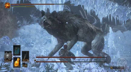 2.打掉一部分血后他会召唤出守墓大狼,大狼远距离会抛出冰块,近距会甩头撕咬攻击,都可以用盾牌稳住。中距离会使用连续龙车,保持移动,看准时机翻滚,使用这一招的前兆是嘴上冒气的时候。尽量保持中近距离,减少它突袭的机会,王墓的守护人如果一直用魔法干扰的话可以找掩体躲。总体打法是把狼和人分离开再优先消灭一方,个人推荐先杀狼。