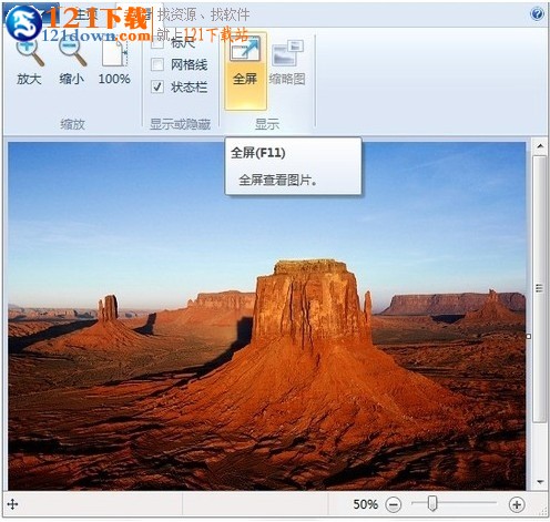 Windows7画图还提供了“全屏”功能,可以在整个屏幕上以全屏方式查看图片。操作方法:在画图“查看”选项卡的“显示”栏目中,单击“全屏”,即可全屏查看图片,非常方便;需要退出全屏时,单击显示的图片即可返回“画图”窗口。