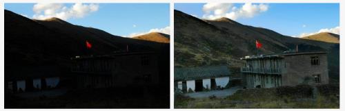 1. 明暗层次不失真:图例在大幅提亮了暗区(山峦、房屋)的情况下,保持亮区(蓝天白云)毫不失真。
