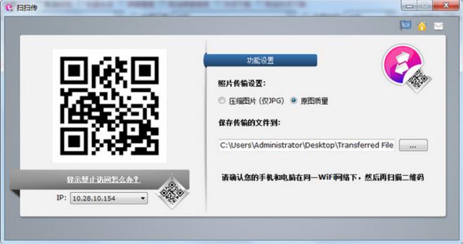 这款工具的最大特点就是方便,它不需要您在手机上安装任何App,只需在电脑上安装扫扫传程序就可以了。您只需要用您的iOS相机或者微信/QQ等能扫二维码的App扫一扫程序界面显示的二维码,就可以立刻开始传输文件到电脑了。扫扫传支持批量传输,可以让您一次性传输上百个文件,并且因为优化了网络连接,传输速度非常快,几秒钟就可以传输非常多的照片。